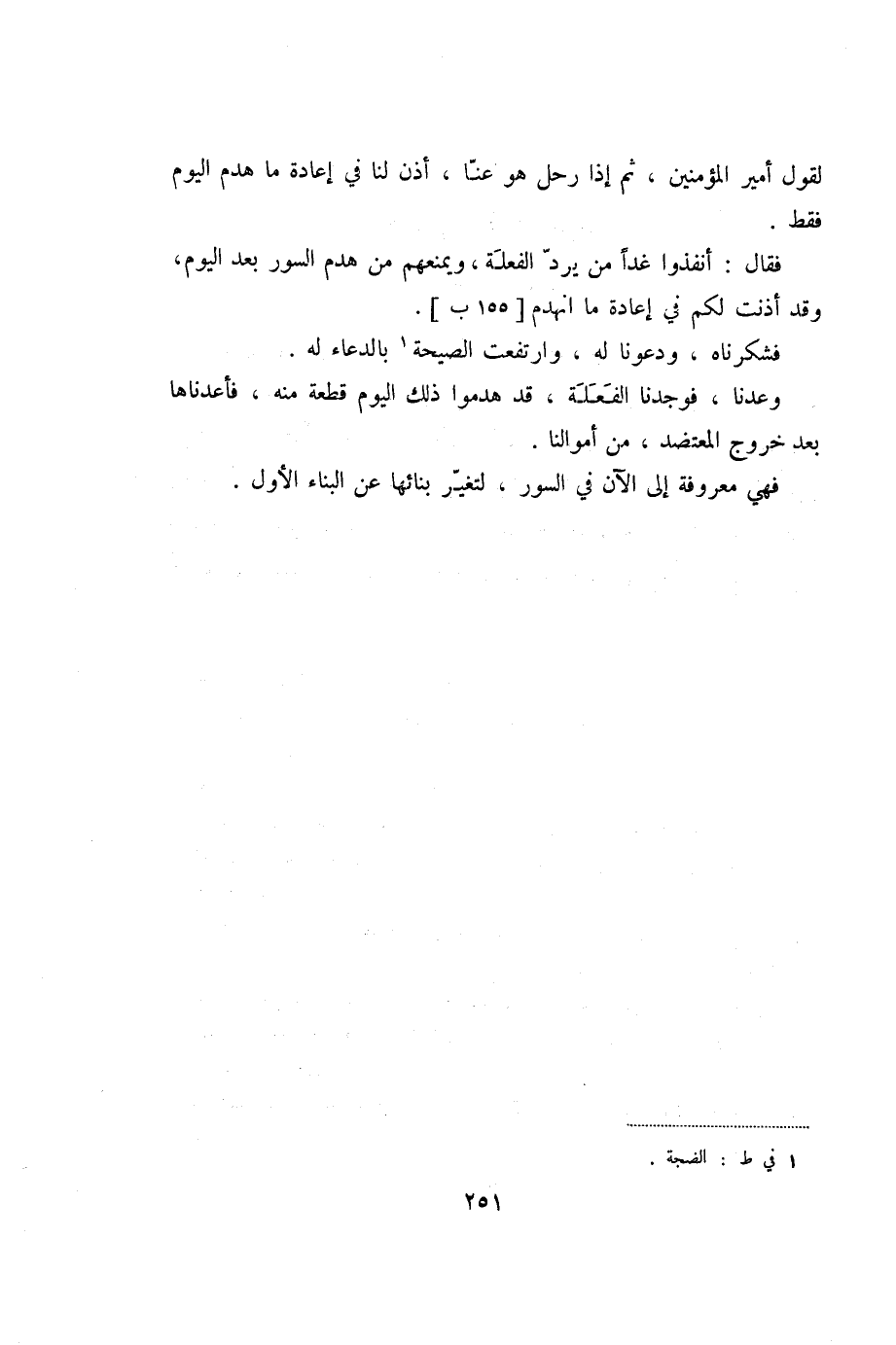 فقال: أنفذوا غدا من يردّ الفعلة، ويمنعهم من هدم السور بعد اليوم، وقد أذنت لكم في إعادة ما انهدم [155 ب] .