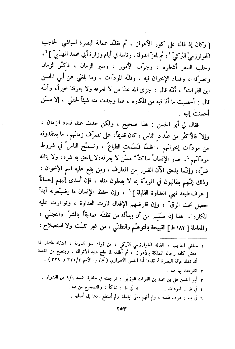 [وكان إذ ذاك على كور الأهواز، ثم تقلّد عمالة البصرة لسباشي الحاجب الخوارزميّ التركيّ «1» ، ثم لمعزّ الدولة، رئاسة في أيام وزارة أبي محمد المهلّبيّ] «2» ، وحلب الدهر أشطره، وجرّب الأمور، وسبر الزمان، ذكر الزمان وتصرّفه، وفساد الإخوان فيه، وقلّة المودّات، وما بلغني عن أبي الحسن ابن الفرات «3» ، أنّه قال: جزى الله عنّا من لا نعرفه ولا يعرفنا خيرا، وأنّه قال: أحصيت ما أنا فيه من المكاره، فما وجدت منه شيئا لحقني، إلا ممّن أحسنت إليه.