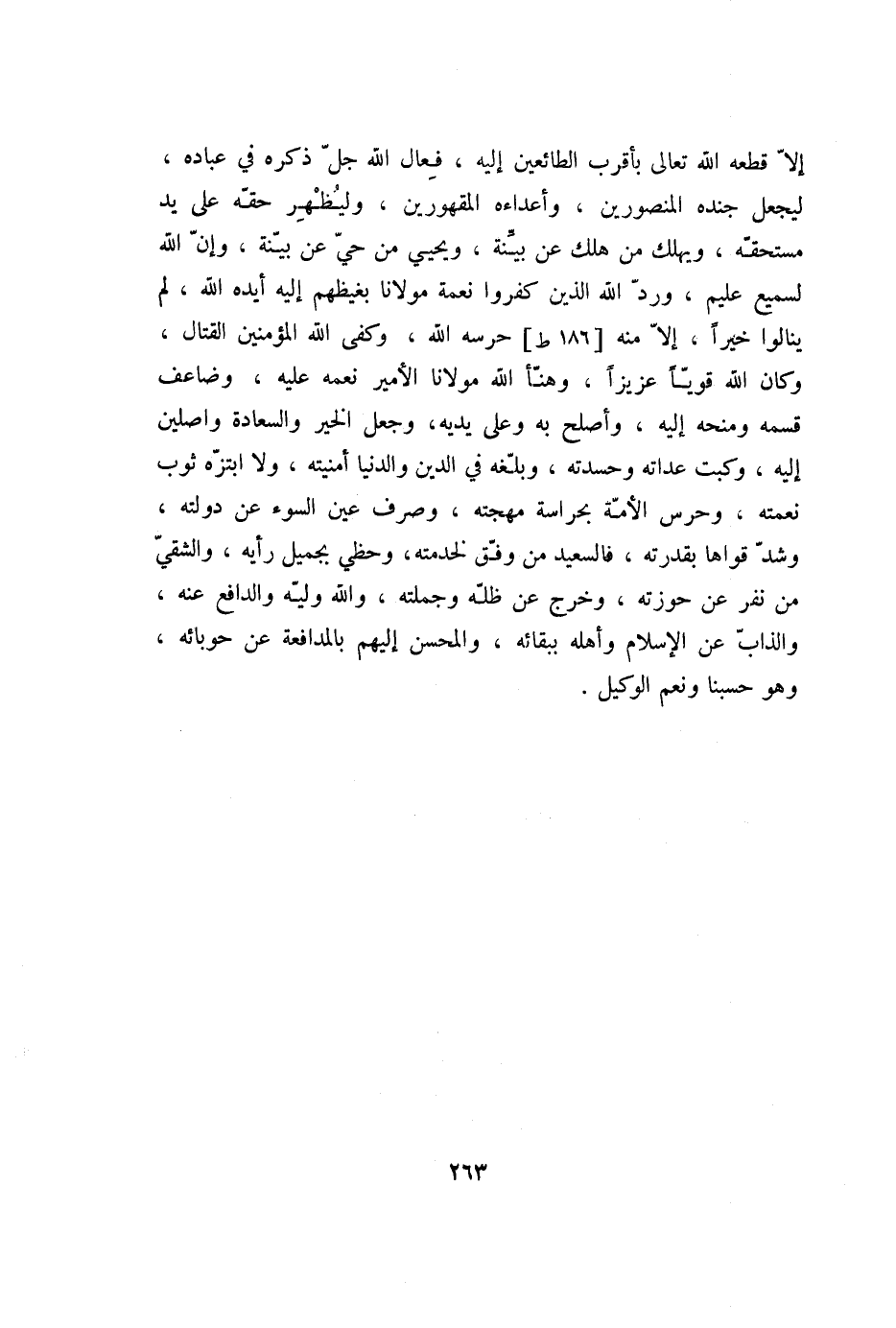 إلّا قطعه الله تعالى بأقرب الطائعين إليه، فعال الله جلّ ذكره في عباده، ليجعل جنده المنصورين، وأعداءه المقهورين، وليظهر حقّه على يد مستحقّه، ويهلك من هلك عن بيّنة، ويحيي من حيّ عن بيّنة، وإنّ الله لسميع عليم، وردّ الله الذين كفروا نعمة مولانا بغيظهم إليه أيده الله، لم ينالوا خيرا، إلّا منه [186 ط] حرسه الله، وكفى الله المؤمنين القتال، وكان الله قويّا عزيزا، وهنّأ الله مولانا الأمير نعمه عليه، وضاعف قسمه ومنحه إليه، وأصلح به وعلى يديه، وجعل الخير والسعادة واصلين إليه، وكبت عداته وحسدته، وبلّغه في الدين والدنيا أمنيته، ولا ابتزّه ثوب نعمته، وحرس الأمّة بحراسة مهجته، وصرف عين السوء عن دولته، وشدّ قواها بقدرته، فالسعيد من وفّق لخدمته، وحظي بجميل رأيه، والشقيّ من نفر عن حوزته، وخرج عن ظلّه وجملته، والله وليّه والدافع عنه، والذابّ عن الإسلام وأهله ببقائه، والمحسن إليهم بالمدافعة عن حوبائه، وهو حسبنا ونعم الوكيل.