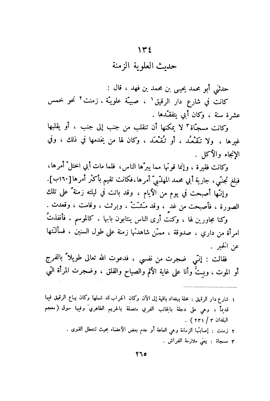 كانت في شارع دار الرقيق «1» ، صبيّة علويّة، زمنت «2» نحو خمس عشرة سنة، وكان أبي يتفقّدها.