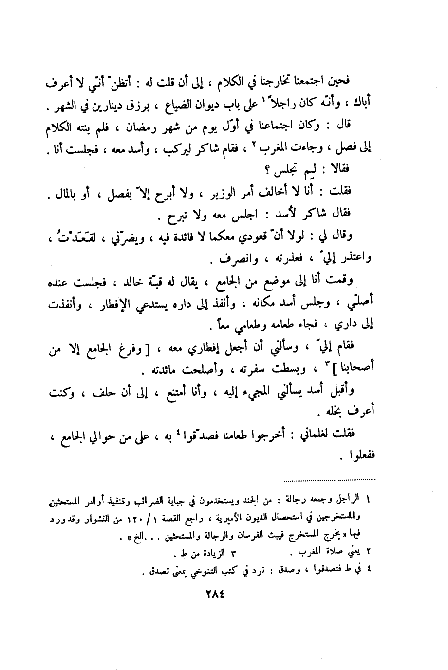 قال: وكان اجتماعنا في أوّل يوم من شهر رمضان، فلم ينته الكلام إلى فصل، وجاءت المغرب «2» ، فقام شاكر ليركب، وأسد معه، فجلست أنا.