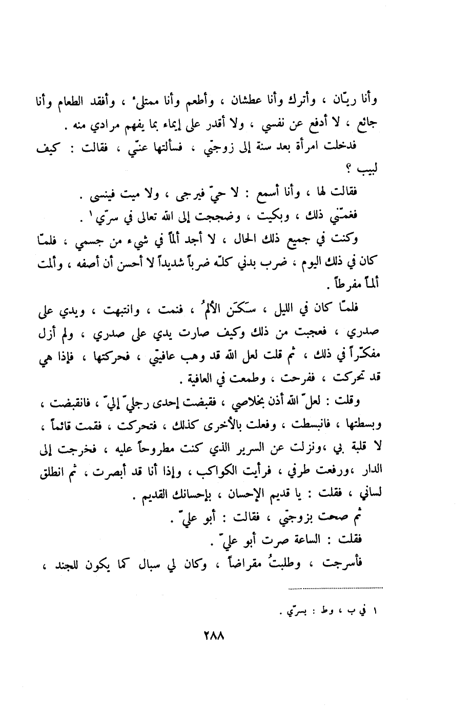 فلمّا كان في الليل، سكن الألم، فنمت، وانتبهت، ويدي على صدري، فعجبت من ذلك وكيف صارت يدي على صدري، ولم أزل مفكّرا في ذلك، ثم قلت لعل الله قد وهب عافيتي، فحركتها، فإذا هي قد تحركت، ففرحت، وطمعت في العافية.