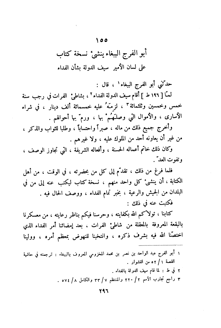 155 أبو الفرج الببغاء ينشىء نسخة كتاب على لسان الأمير سيف الدولة بشأن الفداء