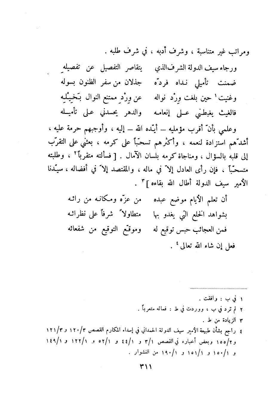 وعلمي بأنّ أقرب مؤمليه- أيّده الله- إليه، وأوجبهم حرمة عليه، أشدّهم استزادة لنعمه، وأكثرهم تسحّبا على كرمه، بعثني على التقرّب إلى قلبه بالسؤال، ومناجاة كرمه بلسان الآمال. [فسألته متقربا «2» ، وطلبته متسحّبا، فإن رأى العادل إلّا في ماله، والمقتصد إلّا في أفضاله، سيّدنا الأمير سيف الدولة أطال الله بقاءه] «3» .