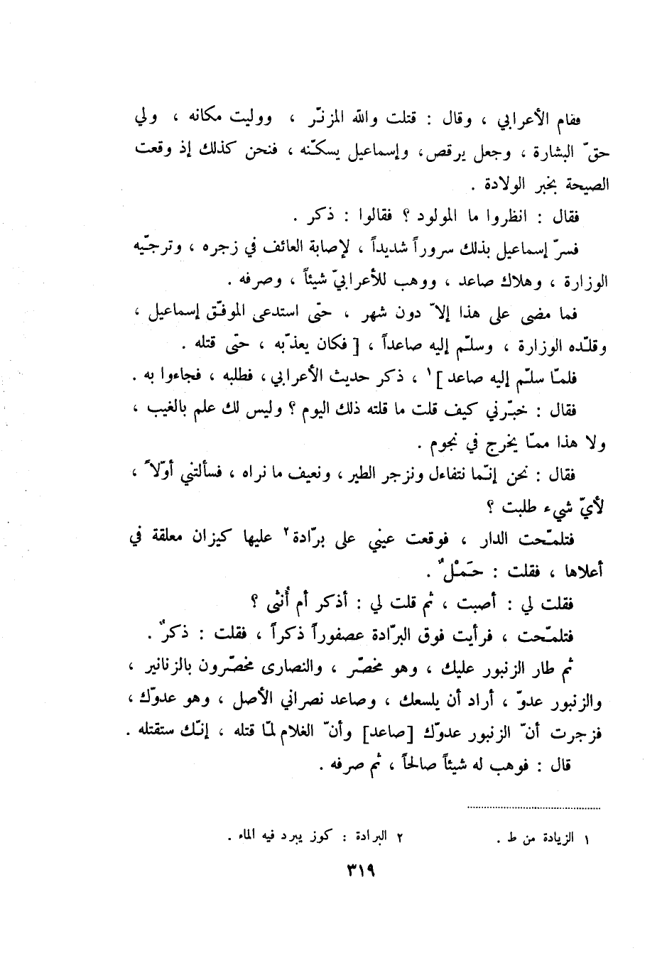 فقام الأعرابي، وقال: قتلت والله المزنّر، ووليت مكانه، ولي حقّ البشارة، وجعل يرقص، وإسماعيل يسكّنه، فنحن كذلك إذ وقعت الصيحة بخبر الولادة.