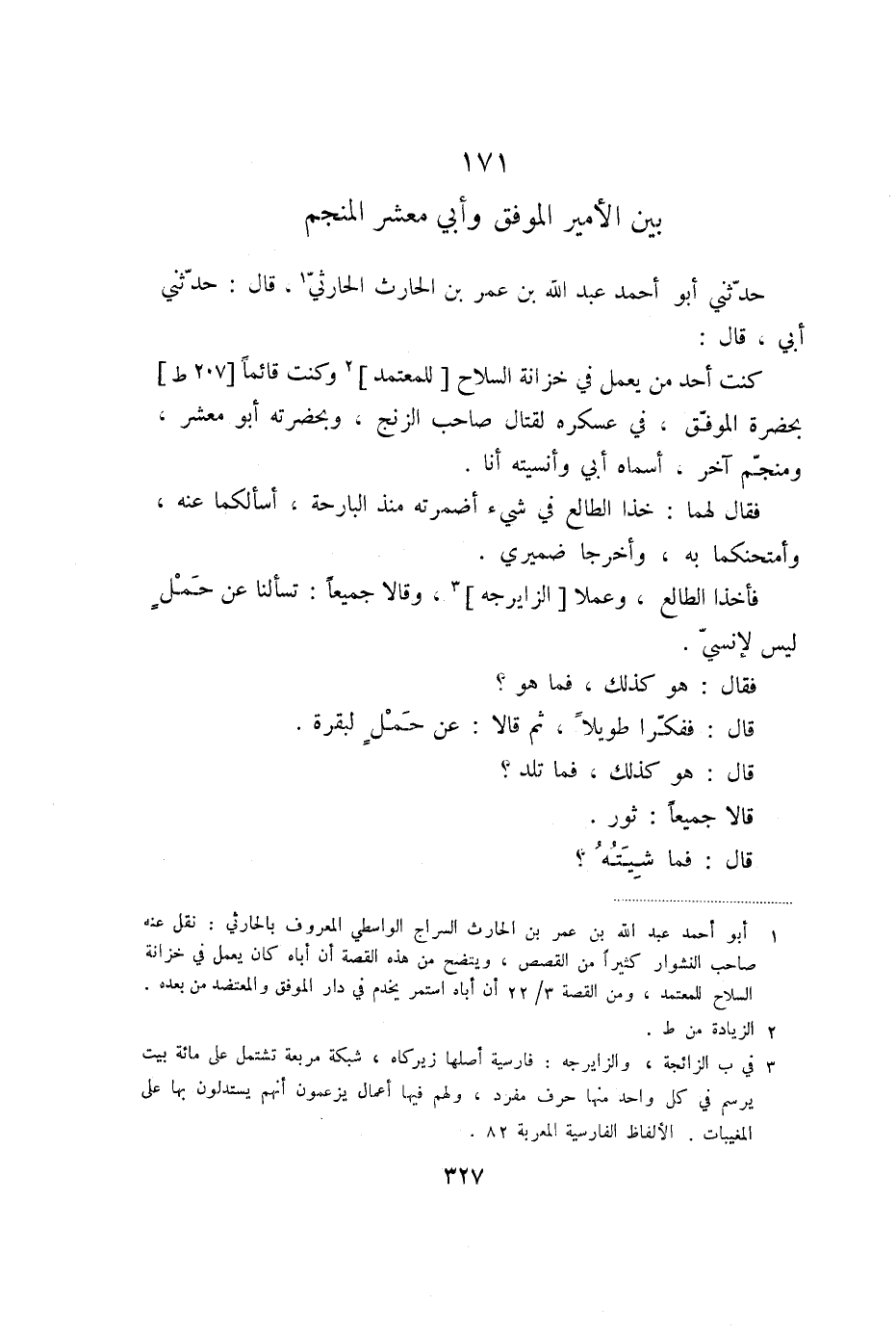 كنت أحد من يعمل في خزانة السلاح [للمعتمد] «2» وكنت قائما [207 ط] بحضرة الموفّق، في عسكره لقتال صاحب الزنج، وبحضرته أبو معشر، ومنجّم آخر، أسماه أبي وأنسيته أنا.