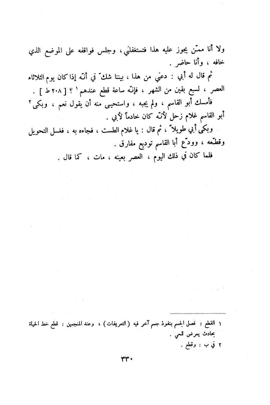 ثم قال له أبي: دعني من هذا، بيننا شكّ في أنّه إذا كان يوم الثلاثاء العصر، لسبع بقين من الشهر، فإنّه ساعة قطع عندهم «1» ؟ [208 ط] .