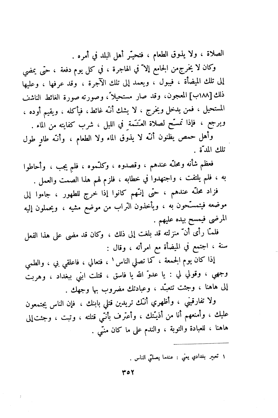 وكان لا يخرج من الجامع إلّا في الهاجرة، في كل يوم دفعة، حتى يمضي إلى تلك الميضأة، فيبول، ويعمد إلى تلك الآجرة، وقد عرفها، وعليها ذلك [188 ب] المعجون، وقد صار مستحيلا، وصورته صورة الغائط الناشف المستحيل، فمن يدخل ويخرج، لا يشك أنّه غائط، فيأكله، ويقيم أوده، ويرجع، فإذا تمسّح لصلاة العتمة في الليل، شرب كفايته من الماء.