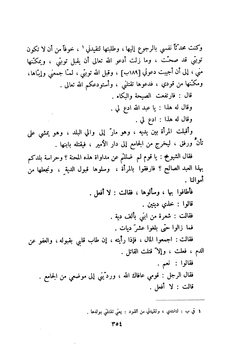 وكنت محدّثا نفسي بالرجوع إليها، وطلبتها لتقيدني «1» ، خوفا من أن لا تكون توبتي قد صحّت، وما زلت أدعو الله تعالى أن يقبل توبتي، ويمكّنها مني، إلى أن أجيبت دعوتي [189 ب] ، وقبل الله توبتي، لمّا جمعني وإيّاها، ومكّنها من قودي، فدعوها تقتلني، وأستودعكم الله تعالى.