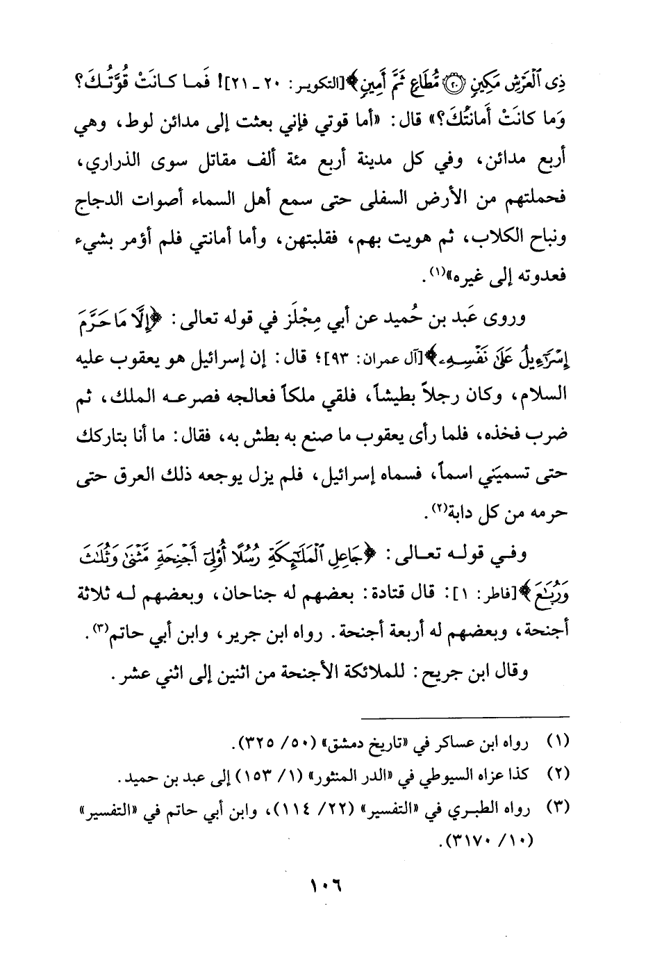 وفي قوله تعالى: {جَاعِلِ الْمَلَائِكَةِ رُسُلًا أُولِي أَجْنِحَةٍ مَثْنَى وَثُلَاثَ وَرُبَاعَ} [فاطر: 1]: قال قتادة: بعضهم له جناحان، وبعضهم له ثلاثة أجنحة، وبعضهم له أربعة أجنحة. رواه ابن جرير، وابن أبي حاتم (¬3).
