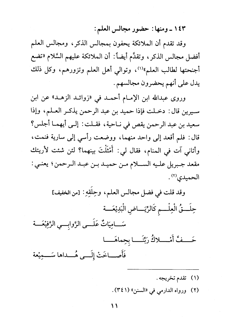 وقد تقدم أن الملائكة يحفون بمجالس الذكر، ومجالس العلم أفضل مجالس الذكر، وتقدَّم أيضاً: أن الملائكة عليهم السَّلام "تضع أجنحتها لطالب العلم" (¬1)، وتوالي أهل العلم وتزورهم، وكل ذلك يدل على أنهم يحضرون مجالسهم.