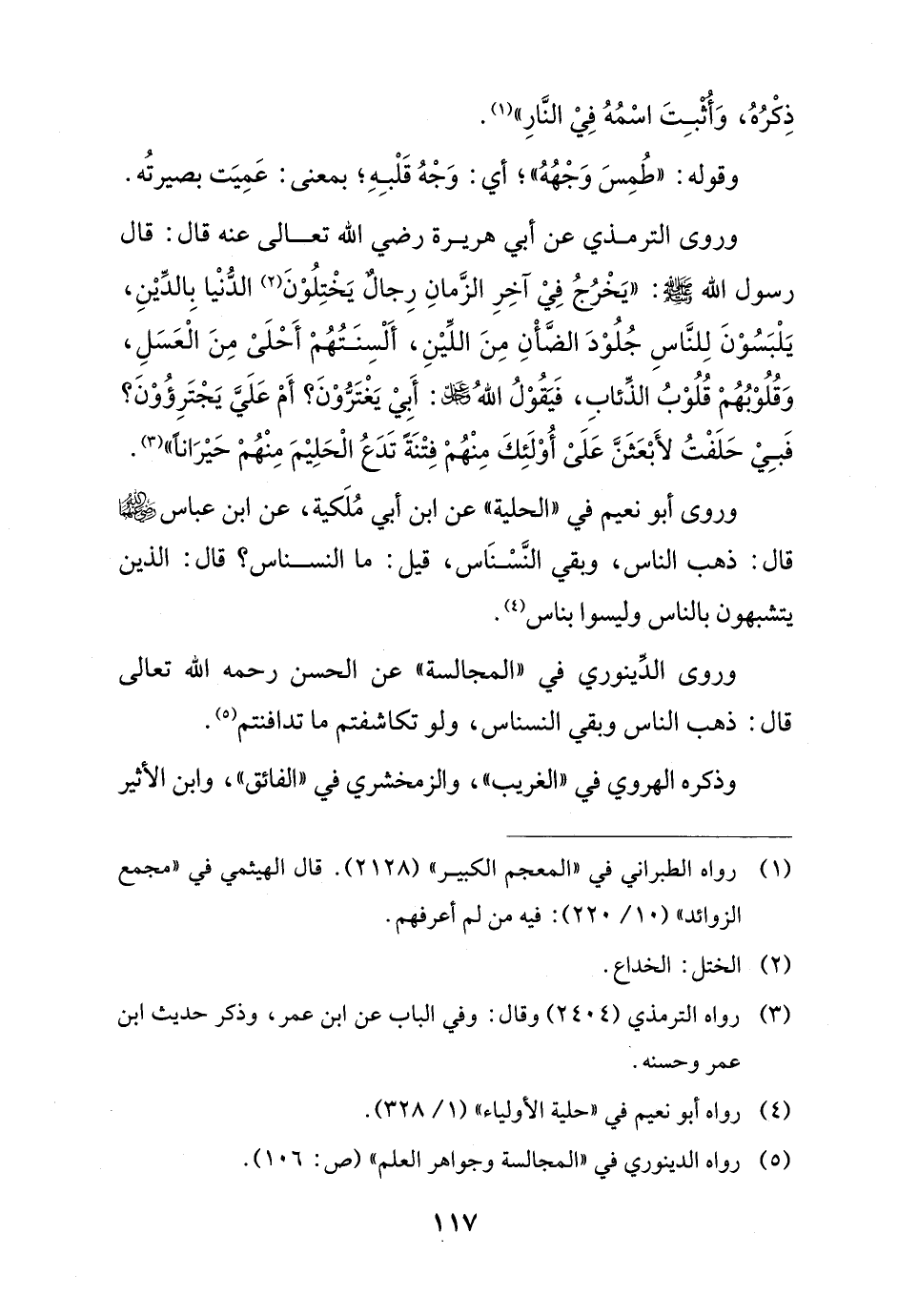وروى الترمذي عن أبي هريرة رضي الله تعالى عنه قال: قال رسول الله - صلى الله عليه وسلم -: "يَخْرُجُ فِيْ آخِرِ الزَّمانِ رِجالٌ يَخْتِلُوْنَ (¬2) الدُّنْيا بِالدِّيْنِ، يَلْبَسُوْنَ لِلنَّاسِ جُلُوْدَ الضَّأْنِ مِنَ اللِّيْنِ، أَلْسِنَتُهُمْ أَحْلَىْ مِنَ الْعَسَلِ، وَقُلُوْبُهُمْ قُلُوْبُ الذِّئابِ، فَيَقُوْلُ اللهُ عز وجل: أَبِيْ يَغْتَرُّوْنَ؟ أَمْ عَلَيَّ يَجْتَرِؤُوْنَ؟ فَبِيْ حَلَفْتُ لأَبْعَثَنَّ عَلَىْ أُوْلَئِكَ مِنْهُمْ فِتْنَةً تَدَعُ الْحَلِيْمَ مِنْهُمْ حَيْرَانًا" (¬3).