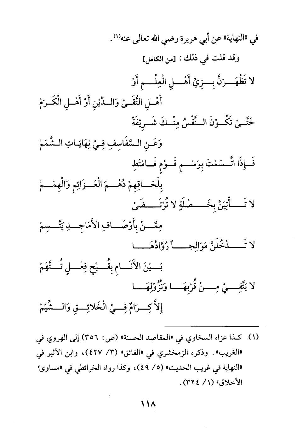 لا تَظْهَرَنَّ بِزِيِّ أَهْلِ الْعِلْمِ أَوْ ... أَهْلِ التُّقَىْ وَالدِّيْنِ أَوْ أَهْلِ الْكَرَمْ