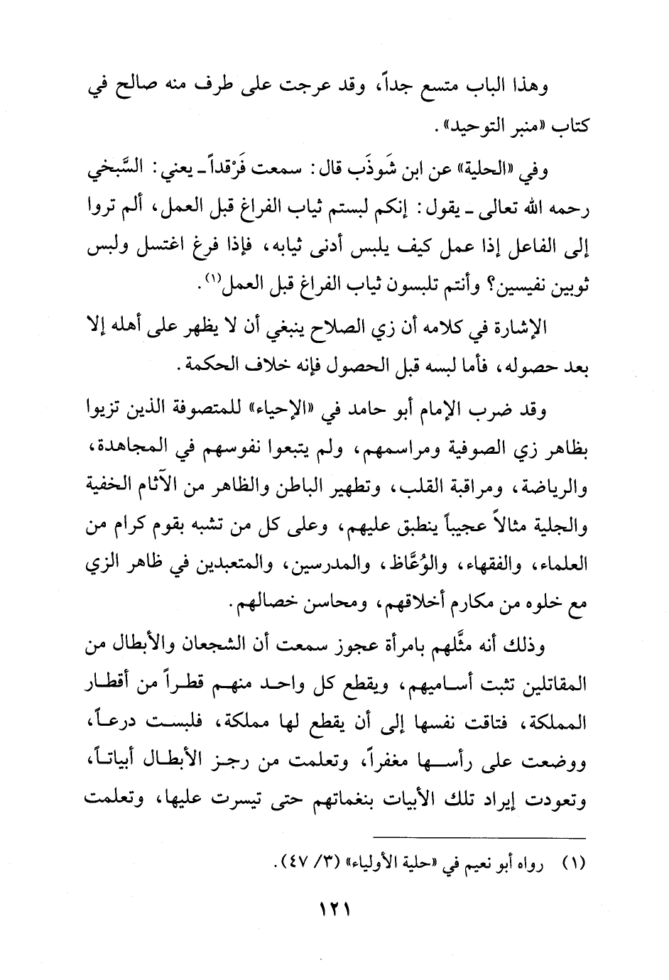 وقد ضرب الإِمام أبو حامد في "الإحياء" للمتصوفة الذين تزيوا بظاهر زي الصوفية ومراسمهم، ولم يتبعوا نفوسهم في المجاهدة، والرياضة، ومراقبة القلب، وتطهير الباطن والظاهر من الآثام الخفية والجلية مثالاً عجيبا ينطبق عليهم، وعلى كل من تشبه بقوم كرام من العلماء، والفقهاء، والوُعَّاظ، والمدرسين، والمتعبدين في ظاهر الزي مع خلوه من مكارم أخلاقهم، ومحاسن خصالهم.