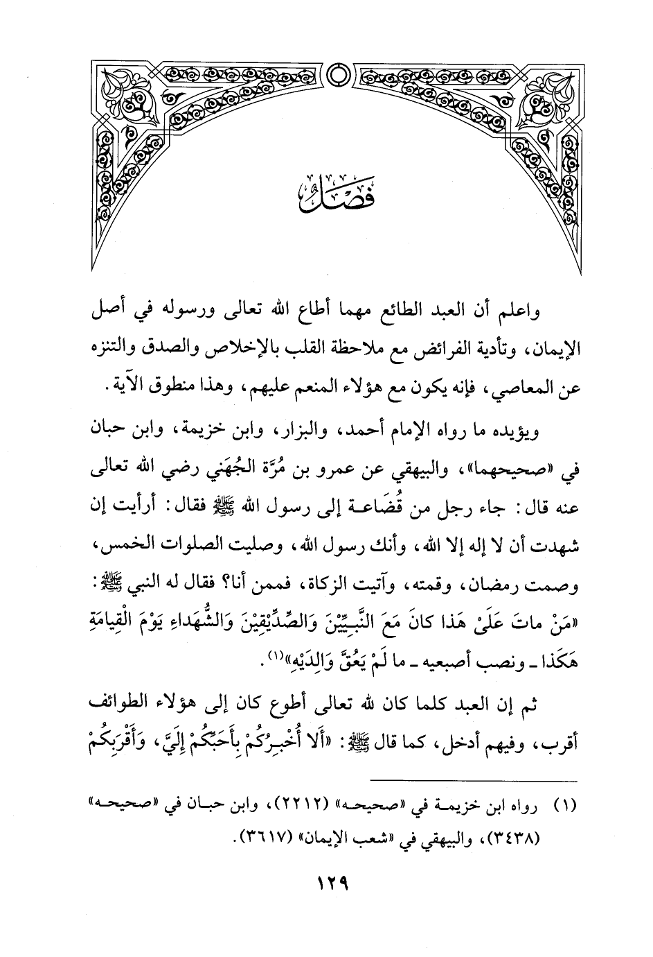 ويؤيده ما رواه الإِمام أحمد، والبزار، وابن خزيمة، وابن حبان في "صحيحهما"، والبيهقي عن عمرو بن مُرَّة الجُهَني رضي الله تعالى عنه قال: جاء رجل من قُضَاعة إلى رسول الله - صلى الله عليه وسلم - فقال: أرأيت إن شهدت أن لا إله إلا الله، وأنك رسول الله، وصليت الصلوات الخمس، وصمت رمضان، وقمته، وآتيت الزكاة، فممن أنا؟ فقال له النبي - صلى الله عليه وسلم -: "مَنْ ماتَ عَلَىْ هَذا كانَ مَعَ النَّبِيِّيْنَ وَالصّدِّيْقِيْنَ وَالشّهَداءِ يَوْمَ الْقِيامَةِ هَكَذا - ونصب أصبعيه - ما لَمْ يَعُقَّ وَالِدَيْهِ" (¬1).