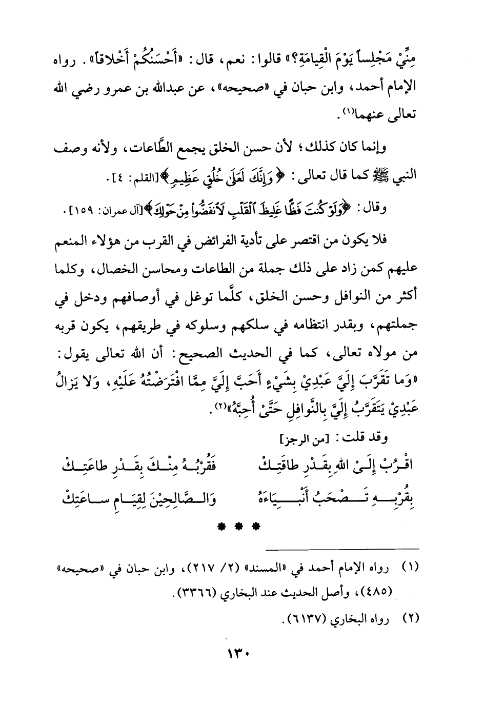 فلا يكون من اقتصر على تأدية الفرائض في القرب من هؤلاء المنعم عليهم كمن زاد على ذلك جملة من الطاعات ومحاسن الخصال، وكلما أكثر من النوافل وحسن الخلق، كلَّما توغل في أوصافهم ودخل في جملتهم، وبقدر انتظامه في سلكهم وسلوكه في طريقهم، يكون قربه من مولاه تعالى، كما في الحديث الصحيح: أن الله تعالى يقول: "وَما تَقَرَّبَ إِلَيَّ عَبْدِيْ بِشَيْءٍ أَحَب إِلَيَّ مِمَا افْتَرَضْتُهُ عَلَيْهِ، وَلا يَزالُ عَبْدِيْ يَتَقَرَّبُ إِلَيَّ بِالنَّوافِلِ حَتَّىْ أُحِبَّهُ" (¬2).