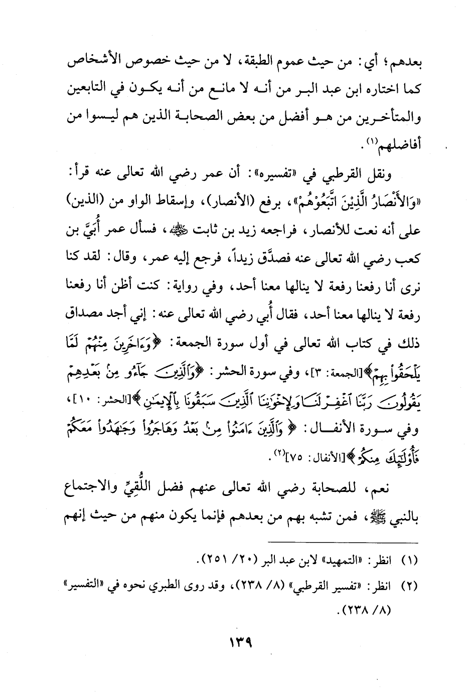 ونقل القرطبي في "تفسيره": أن عمر رضي الله تعالى عنه قرأ: {وَالْأَنْصَارُ الَّذِينَ اتَّبَعُوهُمْ}، برفع (الأنصار)، وإسقاط الواو من (الذين) على أنه نعت للأنصار، فراجعه زيد بن ثابت - رضي الله عنه -، فسأل عمر أُبَيَّ بن كعب رضي الله تعالى عنه فصدق زيدًا، فرجع إليه عمر، وقال: لقد كنا نرى أنا رفعنا رفعة لا ينالها معنا أحد، وفي رواية: كنت أظن أنا رفعنا رفعة لا ينالها معنا أحد، فقال أُبي رضي الله تعالى عنه: إني أجد مصداق ذلك في كتاب الله تعالى في أول سورة الجمعة: {وَآخَرِينَ مِنْهُمْ لَمَّا يَلْحَقُوا بِهِمْ} [الجمعة: 3]، وفي سورة الحشر: {وَالَّذِينَ جَاءُوا مِنْ بَعْدِهِمْ يَقُولُونَ رَبَّنَا اغْفِرْ لَنَا وَلِإِخْوَانِنَا الَّذِينَ سَبَقُونَا بِالْإِيمَانِ} [الحشر: 10]، وفي سورة الأنفال: {وَالَّذِينَ آمَنُوا مِنْ بَعْدُ وَهَاجَرُوا وَجَاهَدُوا مَعَكُمْ فَأُولَئِكَ مِنْكُمْ} [الأنفال: 75] (¬2).