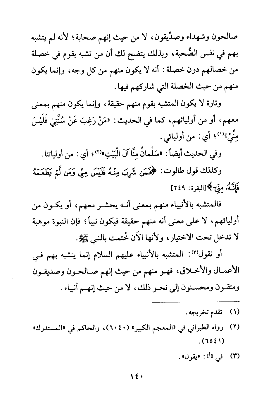 أو نقول (¬3): المتشبه بالأنبياء عليهم السلام إنما يتشبه بهم في الأعمال والأخلاق، فهو منهم من حيث إنهم صالحون وصديقون ومتقون ومحسنون إلى نحو ذلك، لا من حيث إنهم أنبياء.