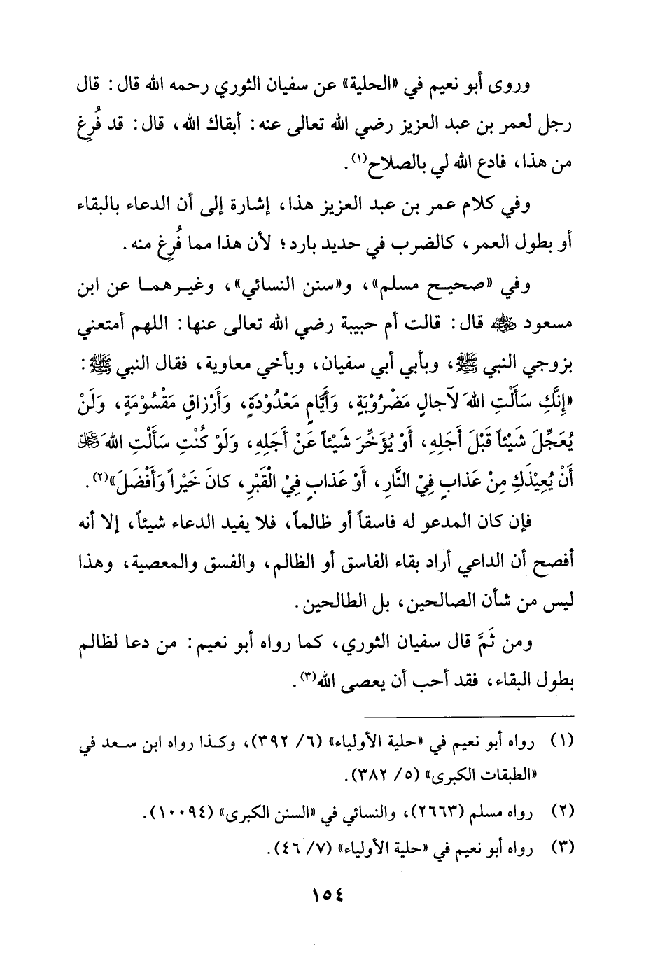 وروى أبو نعيم في "الحلية"، عن سفيان الثوري رحمه الله قال: قال رجل لعمر بن عبد العزيز رضي الله تعالى عنه: أبقاك الله، قال: قد فُرِغ من هذا، فادع الله لي بالصلاح (¬1).