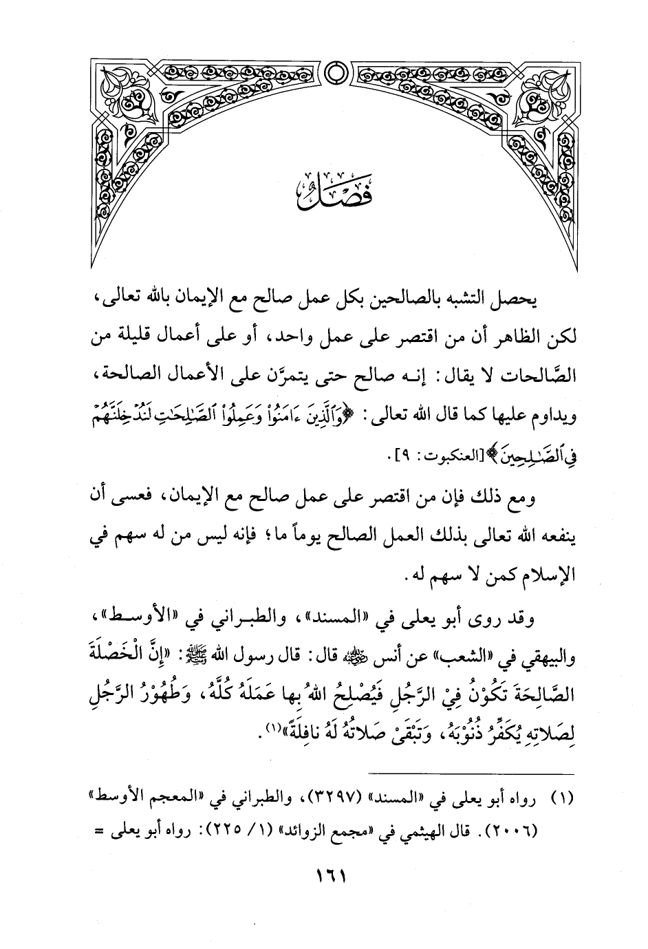 وقد روى أبو يعلى في " المسند"، والطبراني في "الأوسط"، والبيهقي في "الشعب" عن أنس - رضي الله عنه - قال: قال رسول الله - صلى الله عليه وسلم -: "إِنَّ الْخَصْلَةَ الصَّالِحَةَ تَكُوْنُ فِيْ الرَّجُلِ فَيُصْلِحُ اللهُ بِها عَمَلَهُ كُلَّهُ، وَطُهُوْرُ الرَّجُلِ لِصَلاتِهِ يُكَفِّرُ ذُنُوْبَهُ، وَتَبْقَىْ صَلاتُهُ لَهُ نافِلَةً" (¬1).
