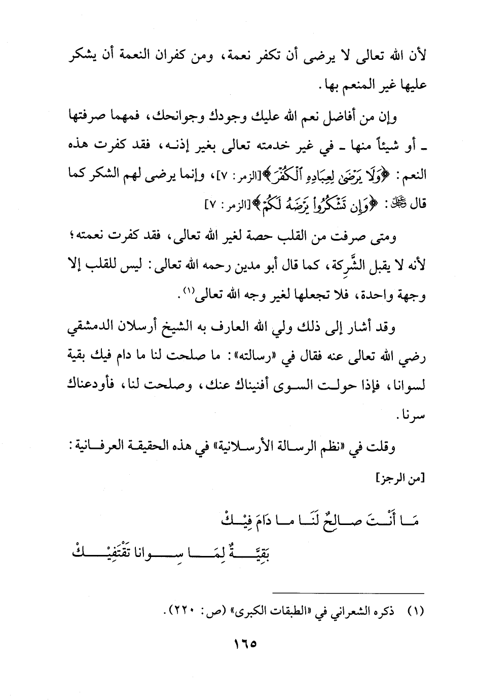 ومتى صرفت من القلب حصة لغير الله تعالى، فقد كفرت نعمته؛ لأنه لا يقبل الشَّرِكة، كما قال أبو مدين رحمه الله تعالى: ليس للقلب إلا وجهة واحدة، فلا تجعلها لغير وجه الله تعالى (¬1).