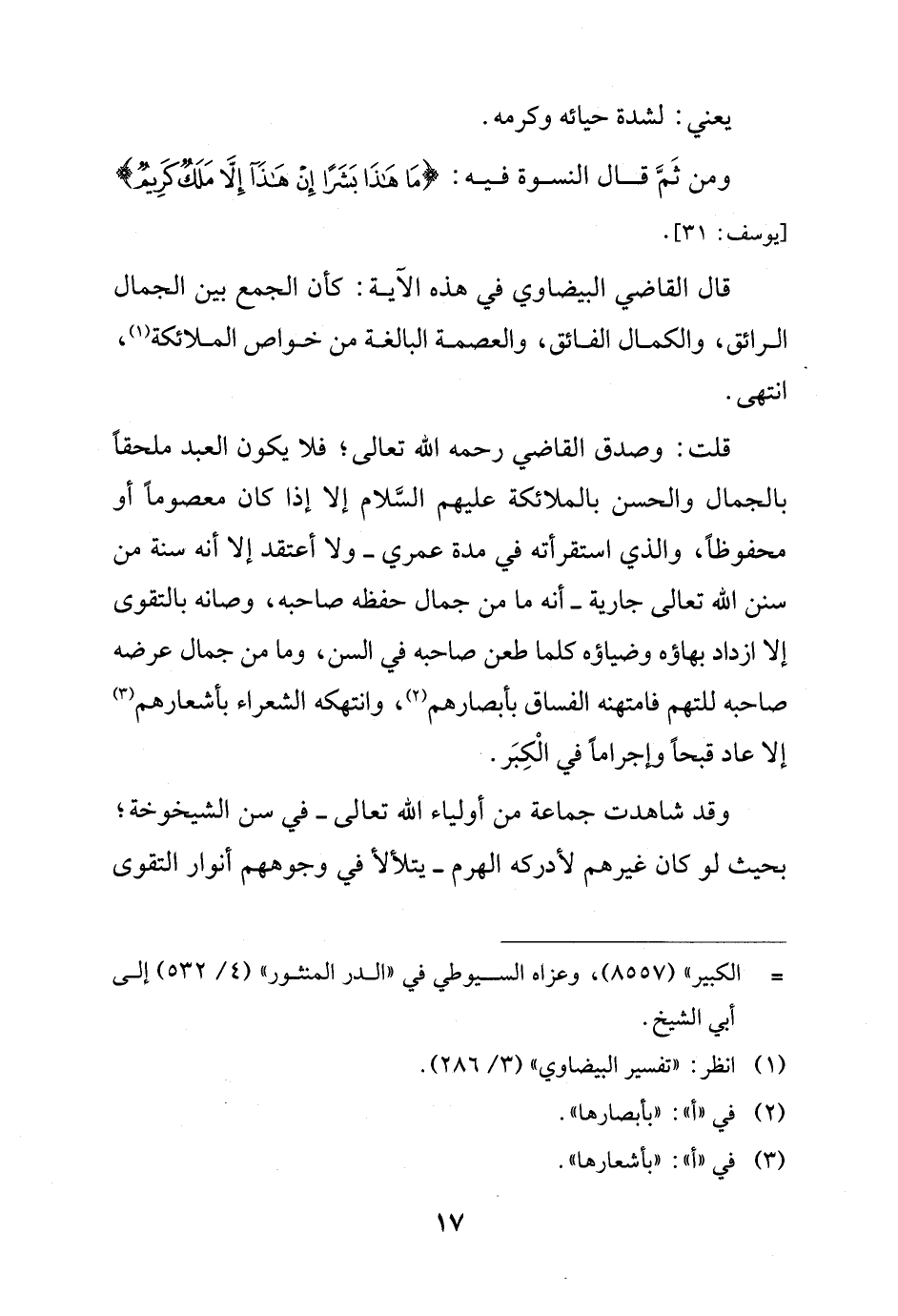 قلت: وصدق القاضي رحمه الله تعالى؛ فلا يكون العبد ملحقاً بالجمال والحسن بالملائكة عليهم السَّلام إلا إذا كان معصوماً أو محفوظاً، والذي استقرأته في مدة عمري - ولا أعتقد إلا أنه سنة من سنن الله تعالى جارية - أنه ما من جمال حفظه صاحبه، وصانه بالتقوى إلا ازداد بهاؤه وضياؤه كما طعن صاحبه في السن، وما من جمال عرضه صاحبه للتهم فامتهنه الفساق بأبصارهم (¬2)، وانتهكه الشعراء بأشعارهم (¬3) إلا عاد قبحاً وإجراماً في الْكِبَر.