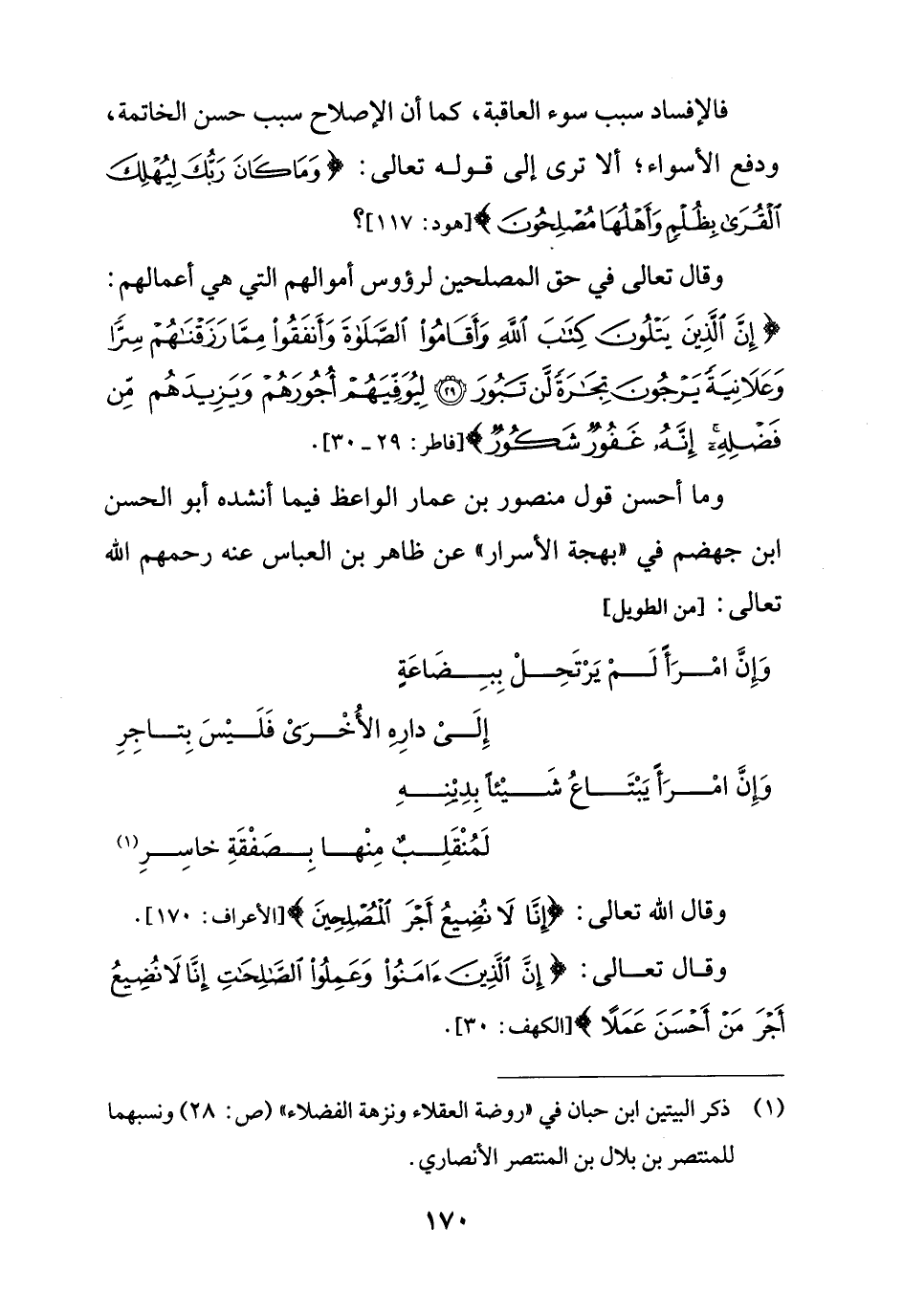 وقال تعالى في حق المصلحين لرؤوس أموالهم التي هي أعمالهم: {إِنَّ الَّذِينَ يَتْلُونَ كِتَابَ اللَّهِ وَأَقَامُوا الصَّلَاةَ وَأَنْفَقُوا مِمَّا رَزَقْنَاهُمْ سِرًّا وَعَلَانِيَةً يَرْجُونَ تِجَارَةً لَنْ تَبُورَ (29) لِيُوَفِّيَهُمْ أُجُورَهُمْ وَيَزِيدَهُمْ مِنْ فَضْلِهِ إِنَّهُ غَفُورٌ شَكُورٌ (30)} [فاطر: 29].