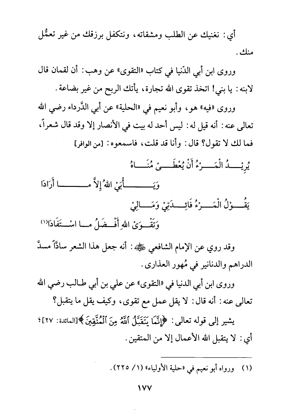 يَقُوْلُ الْمَرْءُ فَائِدَتِيْ وَمَالِيْ ... وَتَقْوَىْ اللهِ أَفْضَلُ ما اسْتَفَادَا (¬1)
