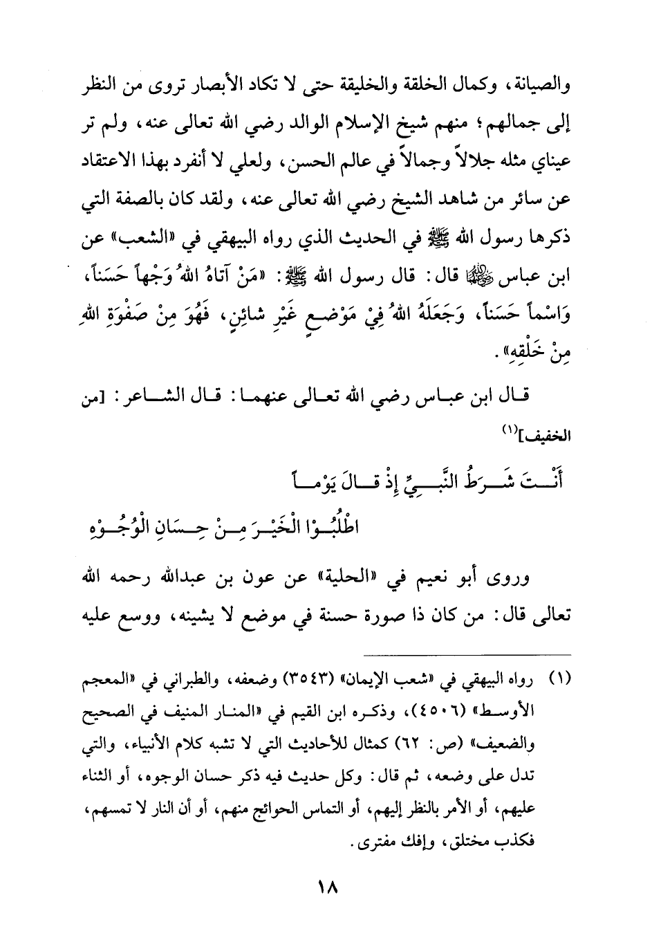 والصيانة، وكمال الخلقة والخليقة حتى لا تكاد الأبصار تروى من النظر إلى جمالهم؛ منهم شيخ الإسلام الوالد رضي الله تعالى عنه، ولم تر عيناي مثله جلالاً وجمالاً في عالم الحسن، ولعلي لا أنفرد بهذا الاعتقاد عن سائر من شاهد الشيخ رضي الله تعالى عنه، ولقد كان بالصفة التي ذكرها رسول الله - صلى الله عليه وسلم - في الحديث الذي رواه البيهقي في "الشعب" عن ابن عباس - رضي الله عنهما - قال: قال رسول الله - صلى الله عليه وسلم -: "مَنْ آتاهُ اللهُ وَجْهاً حَسَناً، وَاسْماً حَسَناً، وَجَعَلَهُ اللهُ فِيْ مَوْضعٍ غَيْرِ شائِنٍ، فَهُوَ مِنْ صَفْوَةِ اللهِ مِنْ خَلْقِهِ".