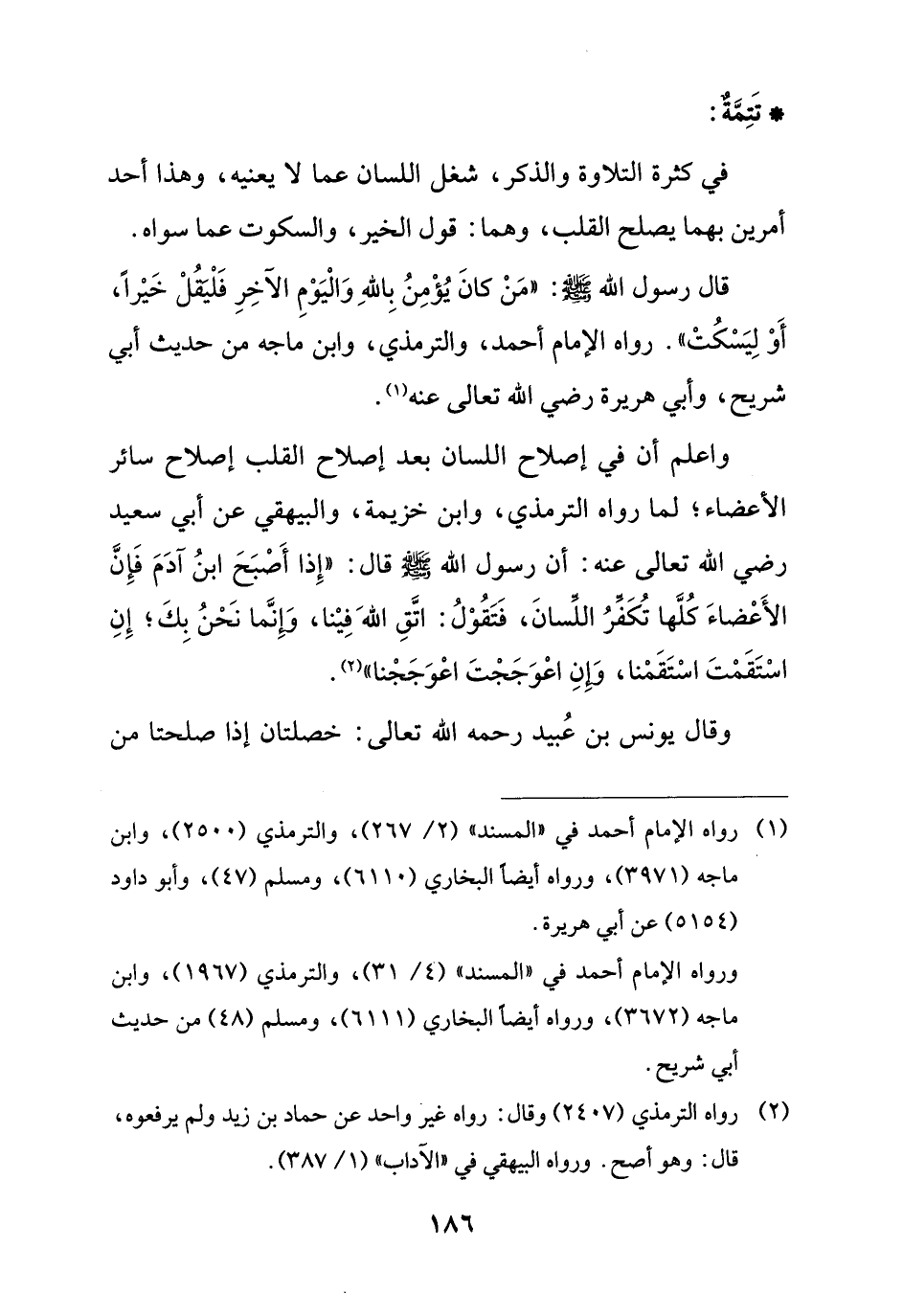واعلم أن في إصلاح اللسان بعد إصلاح القلب إصلاح سائر الأعضاء؛ لما رواه الترمذي، وابن خزيمة، والبيهقي عن أبي سعيد رضي الله تعالى عنه: أن رسول الله - صلى الله عليه وسلم - قال: "إِذا أَصْبَحَ ابنُ آدَمَ فَإِنَّ الأَعْضاءَ كُلَّها تُكَفَّرُ اللّسانَ، فَتَقُوْلُ: اتَّقِ اللهَ فِيْنا، وَإِنَّما نَحْنُ بِكَ؛ إِنِ اسْتَقَمْتَ اسْتَقَمْنا، وإِنِ اعْوَجَجْتَ اعْوَجَجْنا" (¬2).