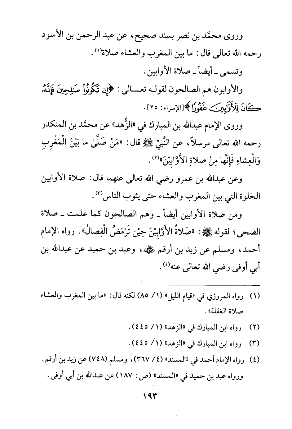 وروى الإمام عبد الله بن المبارك في "الزُّهد" عن محمَّد بن المنكدر رحمه الله تعالى مرسلاً، عن النَّبيِّ - صلى الله عليه وسلم - قال: "مَنْ صَلَّىْ ما بَيْنَ الْمَغْرِبِ وَالْعِشاءِ فَإِنَّها مِنْ صلاةِ الأَوَّابِيْنَ" (¬2).