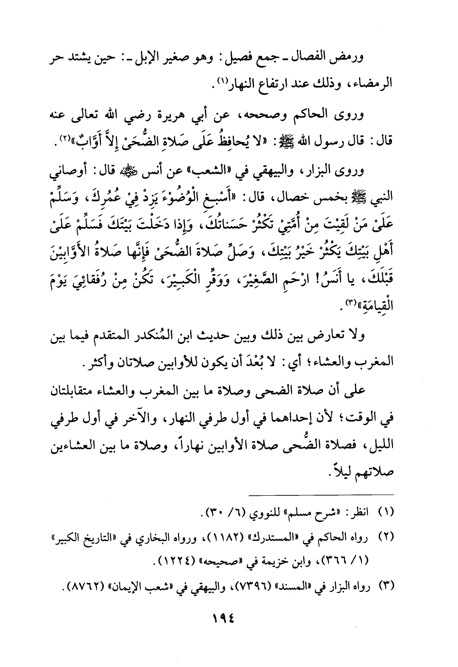 وروى الحاكم وصححه، عن أبي هريرة رضي الله تعالى عنه قال: قال رسول الله - صلى الله عليه وسلم -: "لا يُحافِظُ عَلَى صَلاةِ الضُّحَىْ إِلاَّ أَوَّابٌ" (¬2).