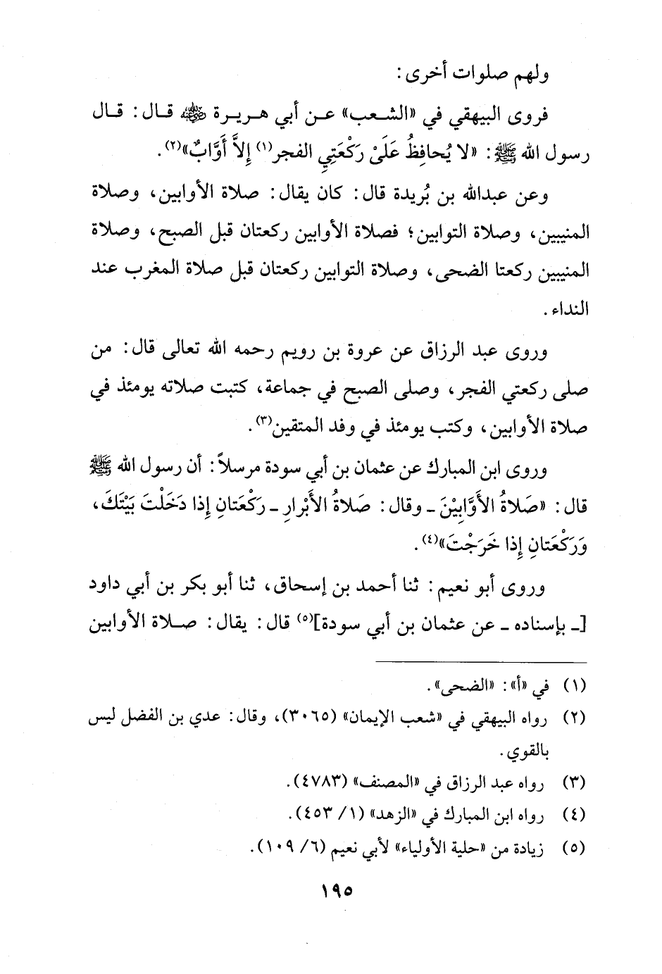 وعن عبد الله بن بُريدة قال: كان يقال: صلاة الأوابين، وصلاة المنيبين، وصلاة التوابين؛ فصلاة الأوابين ركعتان قبل الصبح، وصلاة المنيبين ركعتا الضحى، وصلاة التوابين ركعتان قبل صلاة المغرب عند النداء.