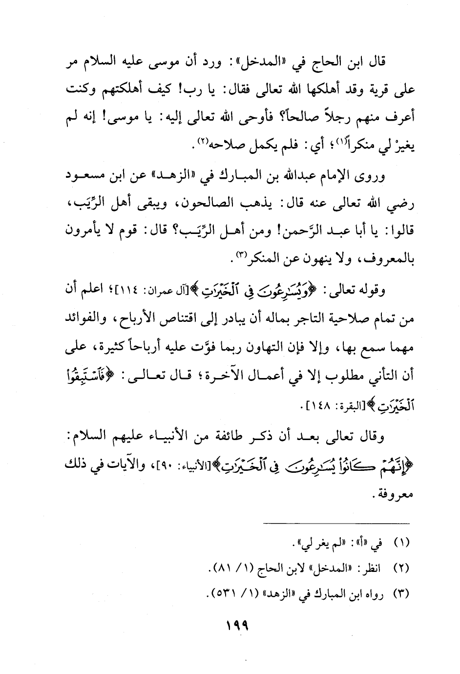 قال ابن الحاج في "المدخل": ورد أن موسى عليه السلام مر على قرية وقد أهلكها الله تعالى فقال: يا رب! كيف أهلكتهم وكنت أعرف منهم رجلاً صالحاً؟ فأوحى الله تعالى إليه: يا موسى! إنه لم يغيرْ لي منكرًا (¬1)؛ أي: فلم يكمل صلاحه (¬2).