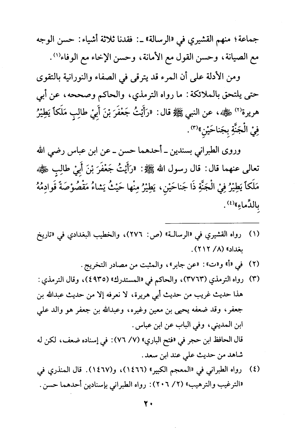 ومن الأدلة على أن المرء قد يترقى في الصفاء والنورانية بالتقوى حتى يلتحق بالملائكة: ما رواه الترمذي، والحاكم وصححه، عن أبي هريرة (¬2) - رضي الله عنه -، عن النبي - صلى الله عليه وسلم - قال: "رَأَيْتُ جَعْفَرَ بْنَ أِبيْ طالِب مَلَكاً يَطِيْرُ فِيْ الْجَنَّةِ بِجَناحَيْنِ" (¬3).
