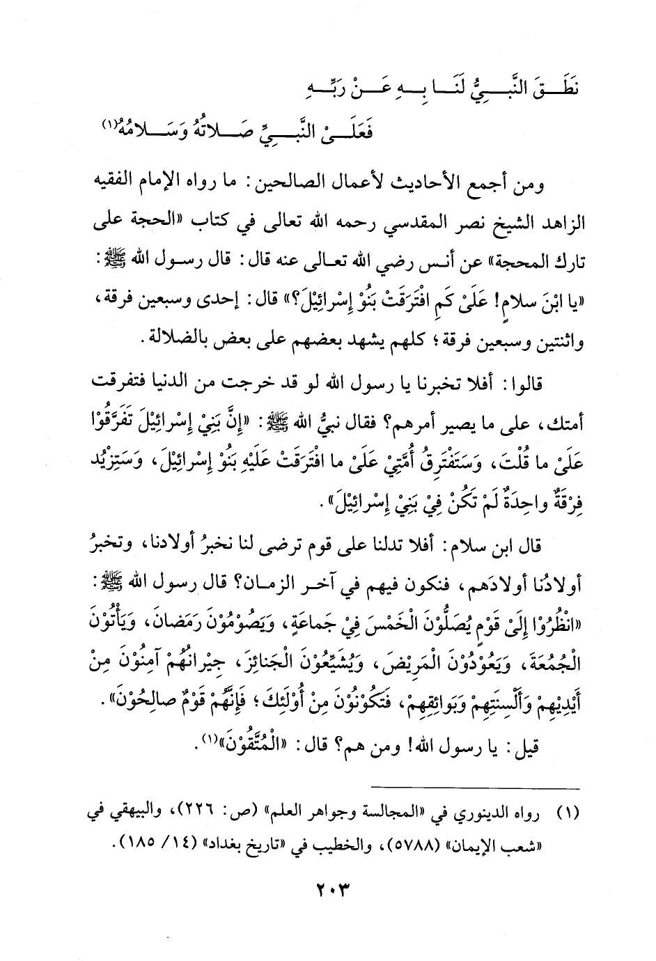 ومن أجمع الأحاديث لأعمال الصالحين: ما رواه الإمام الفقيه الزاهد الشيخ نصر المقدسي رحمه الله تعالى في كتاب "الحجة على تارك المحجة" عن أنس رضي الله تعالى عنه قال: قال رسول الله - صلى الله عليه وسلم -: "يا ابْنَ سلامٍ! عَلَىْ كَمِ افْتَرَقَتْ بَنُوْ إِسْرائِيْلَ؟ " قال: إحدى وسبعين فرقة، واثنتين وسبعين فرقة؛ كلهم يشهد بعضهم على بعض بالضلالة.