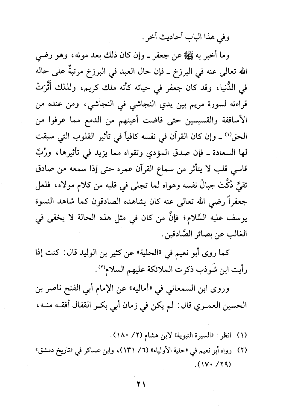 وما أخبر به - صلى الله عليه وسلم - عن جعفر - وإن كان ذلك بعد موته، وهو رضي الله تعالى عنه في البرزخ - فإن حال العبد في البرزخ مرتبةٌ على حاله في الدُّنيا، وقد كان جعفر في حياته كأنه ملك كريم، ولذلك أثَّرَتْ قراءته لسورة مريم بين يدي النجاشي في النجاشي، ومن عنده من الأساقفة والقسيسين حتى فاضت أعينهم من الدمع مما عرفوا من الحق (¬1) - وإن كان القرآن في نفسه كافياً في تأثير القلوب التي سبقت لها السعادة - فإن صدق المؤدي وتقواه مما يزيد في تأثيرها، ورُبَّ قاسي قلب لا يتأثر من سماع القرآن عمره حتى إذا سمعه من صادق تقيٍّ دُكَّتْ جبالُ نفسه وهواه لما تجلى في قلبه من كلام مولاه، فلعل جعفراً رضي الله تعالى عنه كان يشاهده الصادقون كما شاهد النسوة يوسف عليه السَّلام؛ فإنَّ من كان في مثل هذه الحالة لا يخفى في الغالب عن بصائر الصَّادقين.