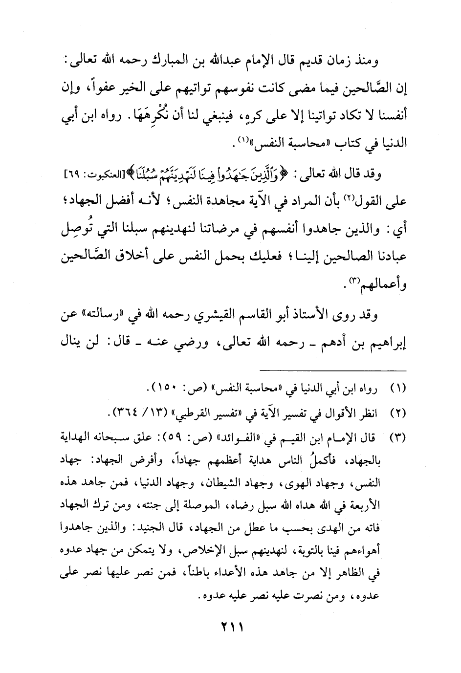 (¬3) قال الإمام ابن القيم في "الفوائد" (ص: 59): علق سبحانه الهداية بالجهاد، فأكملُ الناس هداية أعظمهم جهادًا، وأفرض الجهاد: جهاد النفس، وجهاد الهوى، وجهاد الشيطان، وجهاد الدنيا، فمن جاهد هذه الأربعة في الله هداه الله سبل رضاه، الموصلة إلى جنته، ومن ترك الجهاد فاته من الهدى بحسب ما عطل من الجهاد، قال الجنيد: والذين جاهدوا أهواءهم فينا بالتوبة، لنهدينهم سبل الإخلاص، ولا يتمكن من جهاد عدوه في الظاهر إلا من جاهد هذه الأعداء باطنًا، فمن نصر عليها نصر على عدوه، ومن نصرت عليه نصر عليه عدوه.
