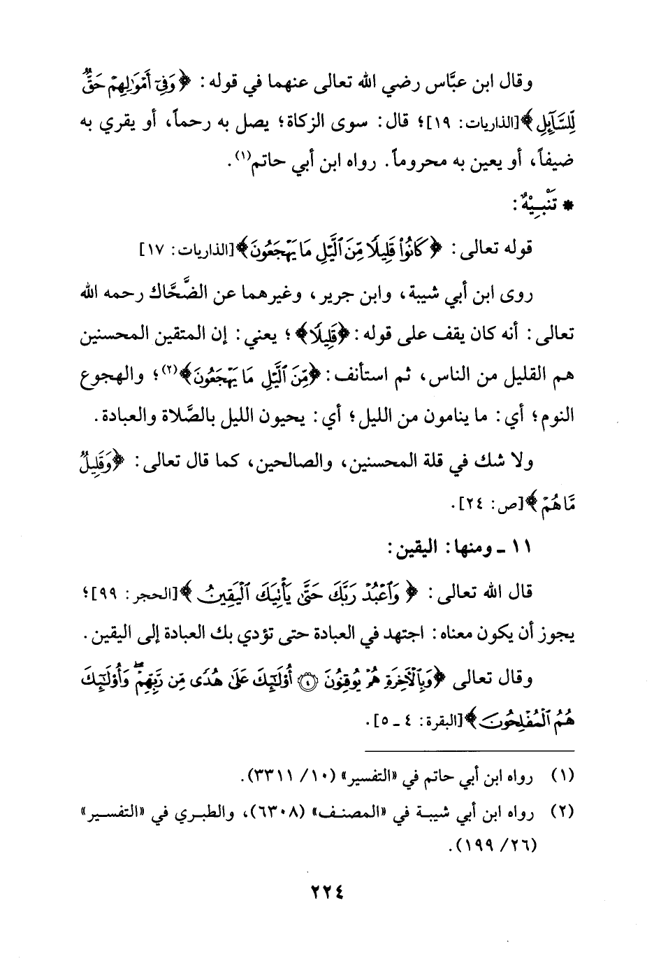 قوله تعالى: {كَانُوا قَلِيلًا مِنَ اللَّيْلِ مَا يَهْجَعُونَ (17)} [الذاريات: 17] روى ابن أبي شيبة، وابن جرير، وغيرهما عن الضَّحَّاك رحمه الله تعالى: أنه كان يقف على قوله: {قَلِيلاً}؛ يعني: إن المتقين المحسنين هم القليل من الناس، ثم استأنف: {مِنَ اللَّيْلِ مَا يَهْجَعُونَ (17)} [الذاريات: 17] (¬2)؛ والهجوع النوم؛ أي: ما ينامون من الليل؛ أي: يحيون الليل بالصَّلاة والعبادة.