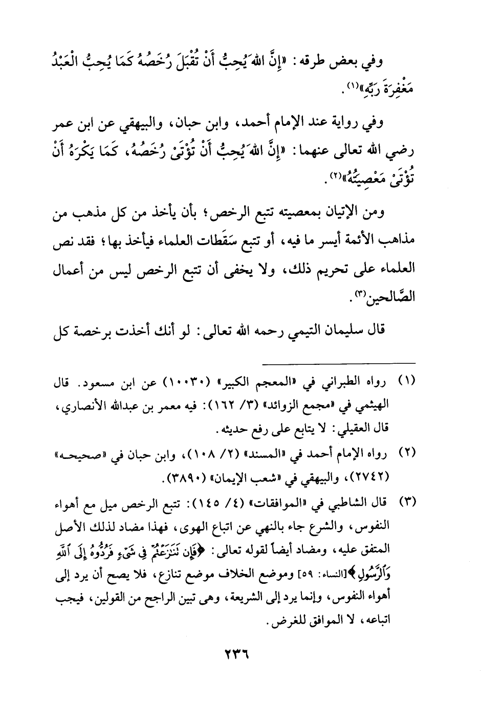 (¬3) قال الشاطبي في "الموافقات" (4/ 145): تتبع الرخص ميل مع أهواء النفوس، والشرع جاء بالنهي عن اتباع الهوى، فهذا مضاد لذلك الأصل المتفق عليه، ومضاد أيضًا لقوله تعالى: {فَإِنْ تَنَازَعْتُمْ فِي شَيْءٍ فَرُدُّوهُ إِلَى اللَّهِ وَالرَّسُولِ} [النساء: 59] وموضع الخلاف موضع تنازع، فلا يصح أن يرد إلى أهواء النفوس، وإنما يرد إلى الشريعة، وهى تبين الراجح من القولين، فيجب اتباعه، لا الموافق للغرض.