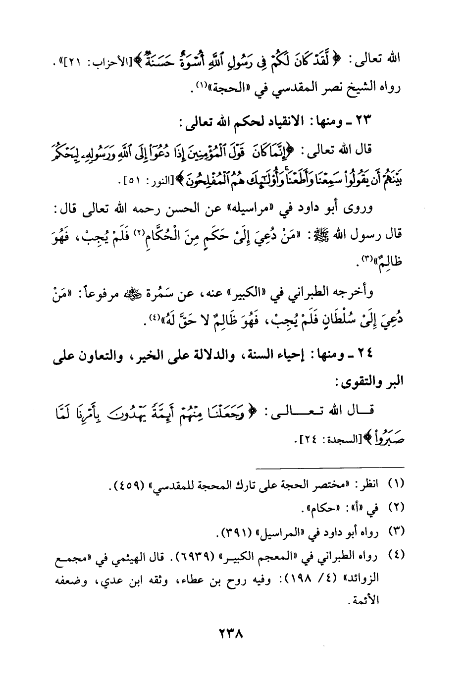 الله تعالى: {لَقَدْ كَانَ لَكُمْ فِي رَسُولِ اللَّهِ أُسْوَةٌ حَسَنَةٌ} [الأحزاب: 21] رواه الشيخ نصر المقدسي في "الحجة" (¬1).