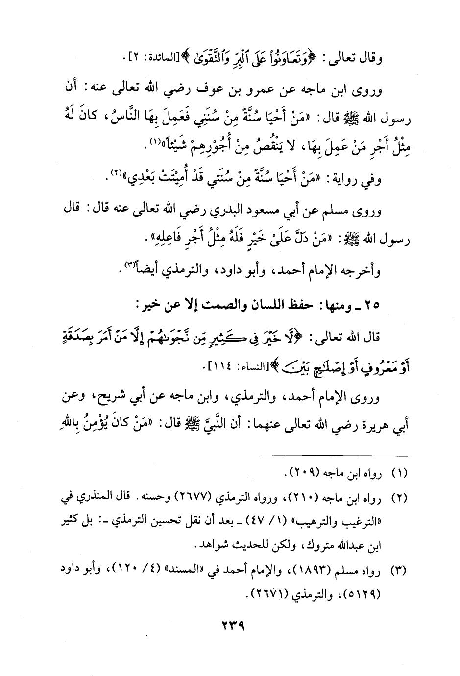 وروى ابن ماجه عن عمرو بن عوف رضي الله تعالى عنه: أن رسول الله - صلى الله عليه وسلم - قال: "مَنْ أَحْيَا سُنَّةً مِنْ سُنَنِي فَعَمِلَ بِهَا النَّاسُ، كانَ لَهُ مِثْلُ أَجْرِ مَنْ عَمِلَ بِهَا، لا يَنْقُصُ مِنْ أُجُوْرِهِمْ شَيْئًا" (¬1).