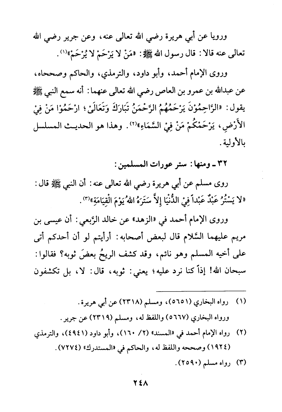 وروى الإمام أحمد، وأبو داود، والترمذي، والحاكم وصححاه، عن عبد الله بن عمرو بن العاص رضي الله تعالى عنهما: أنه سمع النبي - صلى الله عليه وسلم - يقول: "الرَّاحِمُوْنَ يَرْحَمُهُمُ الرَّحْمَنُ تَبَارَكَ وَتَعَالَىْ؛ ارْحَمُوْا مَنْ فِيْ الأَرْضِ، يَرْحَمْكُمْ مَنْ فِيْ السَّمَاءِ" (¬2). وهذا هو الحديث المسلسل بالأولية.