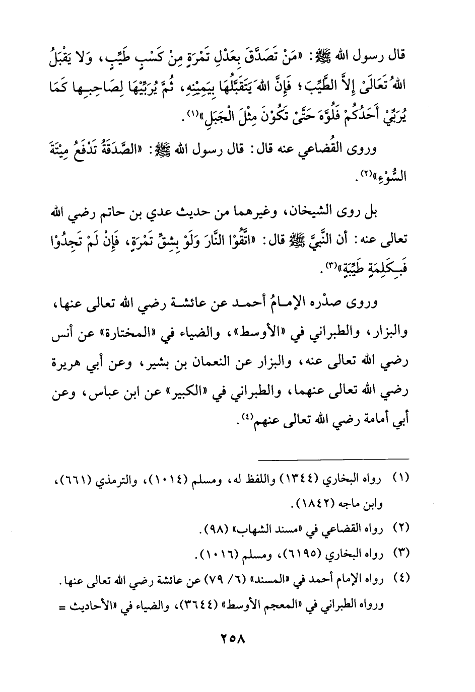 قال رسول الله - صلى الله عليه وسلم -: "مَنْ تَصَدَّقَ بِعَدْلِ تَمْرَةٍ مِنْ كَسْبٍ طَيِّبٍ، وَلا يَقْبَلُ اللهُ تَعَالَىْ إِلاَّ الطَّيِّبَ؛ فَإِنَّ اللهَ يَتَقَبَّلُهَا بِيَمِيْنِهِ، ثُمَّ يُرَبِّيْهَا لِصَاحِبِها كَمَا يُرَبِّيْ أَحَدُكُمْ فَلُوَّهَ حَتَّىْ تَكُوْنَ مِثْلَ الْجَبَلِ " (¬1).