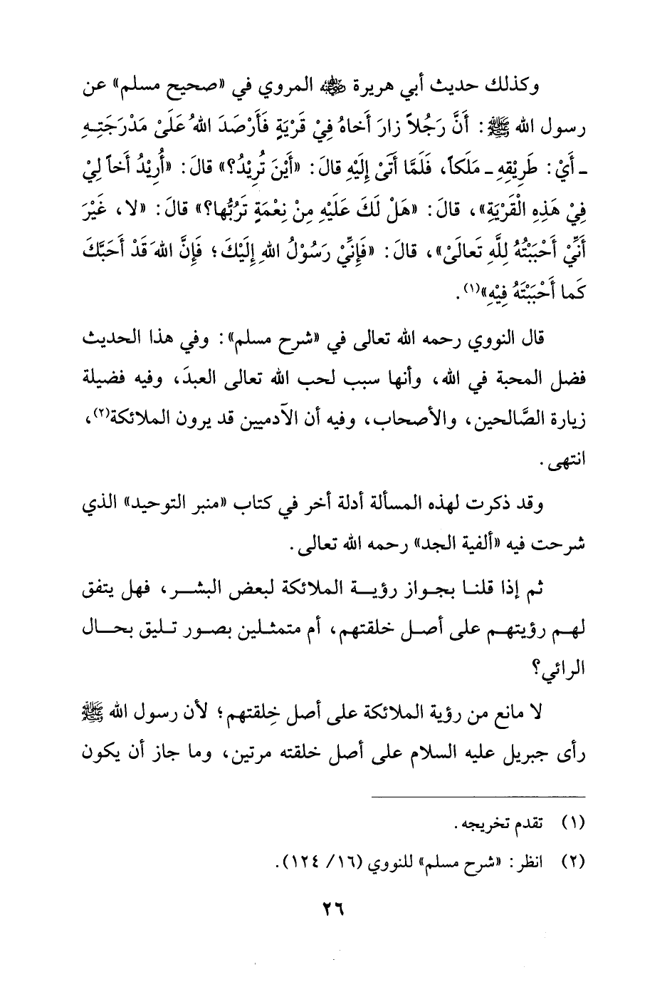 وكذلك حديث أبي هريرة - رضي الله عنه - المروي في "صحيح مسلم" عن رسول الله - صلى الله عليه وسلم -: أَنَّ رَجُلاً زارَ أَخاهُ فِيْ قَرْيَةٍ فَأَرْصَدَ اللهُ عَلَىْ مَدْرَجَتِهِ - أَيْ: طَرِيْقِهِ - مَلَكاً، فَلَمَّا أتَىْ إِلَيْهِ قالَ: "أَيْنَ تُرِيْدُ؟ " لا قالَ: "أُرِيْدُ أَخاً لِيْ فِيْ هَذهِ الْقَرْيَةِ"، قالَ: "هَلْ لَكَ عَلَيْهِ مِنْ نِعْمَةٍ تَرُبُّها؟ " قالَ: "لا، غَيْرَ أَني أَحْبَبْتُهُ لِلَّهِ تَعالَىْ"، قالَ: "فَإِنِّي رَسُوْلُ اللهِ إِلَيْكَ؛ فَإِنَّ اللهَ قَدْ أَحَبَّكَ كَما أَحْبَبْتَهُ فِيْهِ" (¬1).