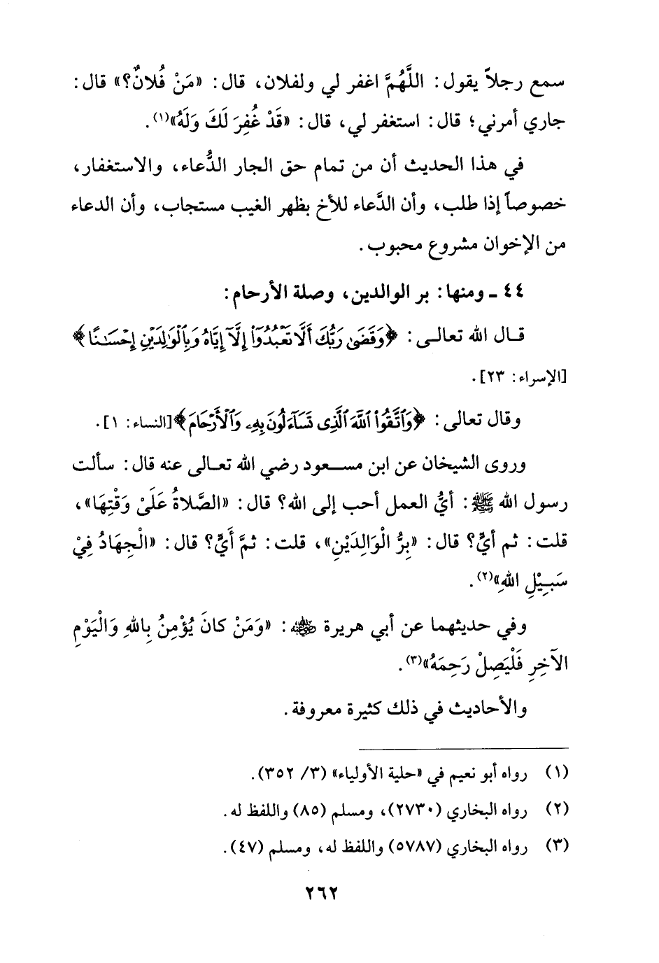 وروى الشيخان عن ابن مسعود رضي الله تعالى عنه قال: سألت رسول الله - صلى الله عليه وسلم -: أيُّ العمل أحب إلى الله؛ قال: "الصَّلاةُ عَلَىْ وَقْتِهَا"، قلت: ثم أيٍّ؟ قال: "برُّ الْوَالِدَيْنِ"، قلت: ثمَّ أَيٍّ؟ قال: "الْجِهَادُ فِيْ سَبِيْلِ اللهِ" (¬2).
