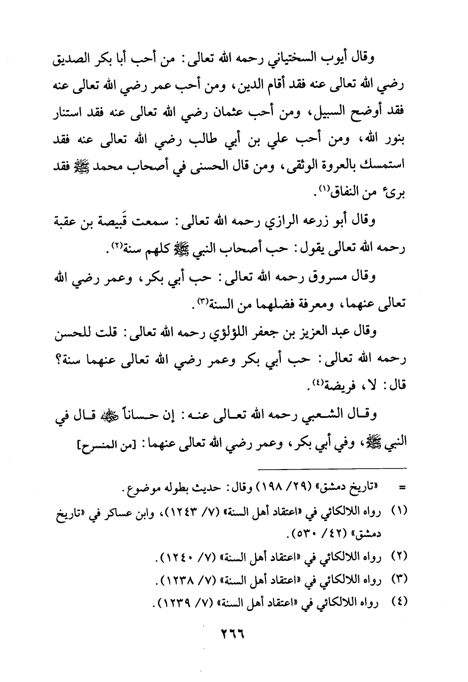 وقال عبد العزيز بن جعفر اللؤلؤي رحمه الله تعالى: قلت للحسن رحمه الله تعالى: حب أبي بكر وعمر رضي الله تعالى عنهما سنة؟ قال: لا، فريضة (¬4).