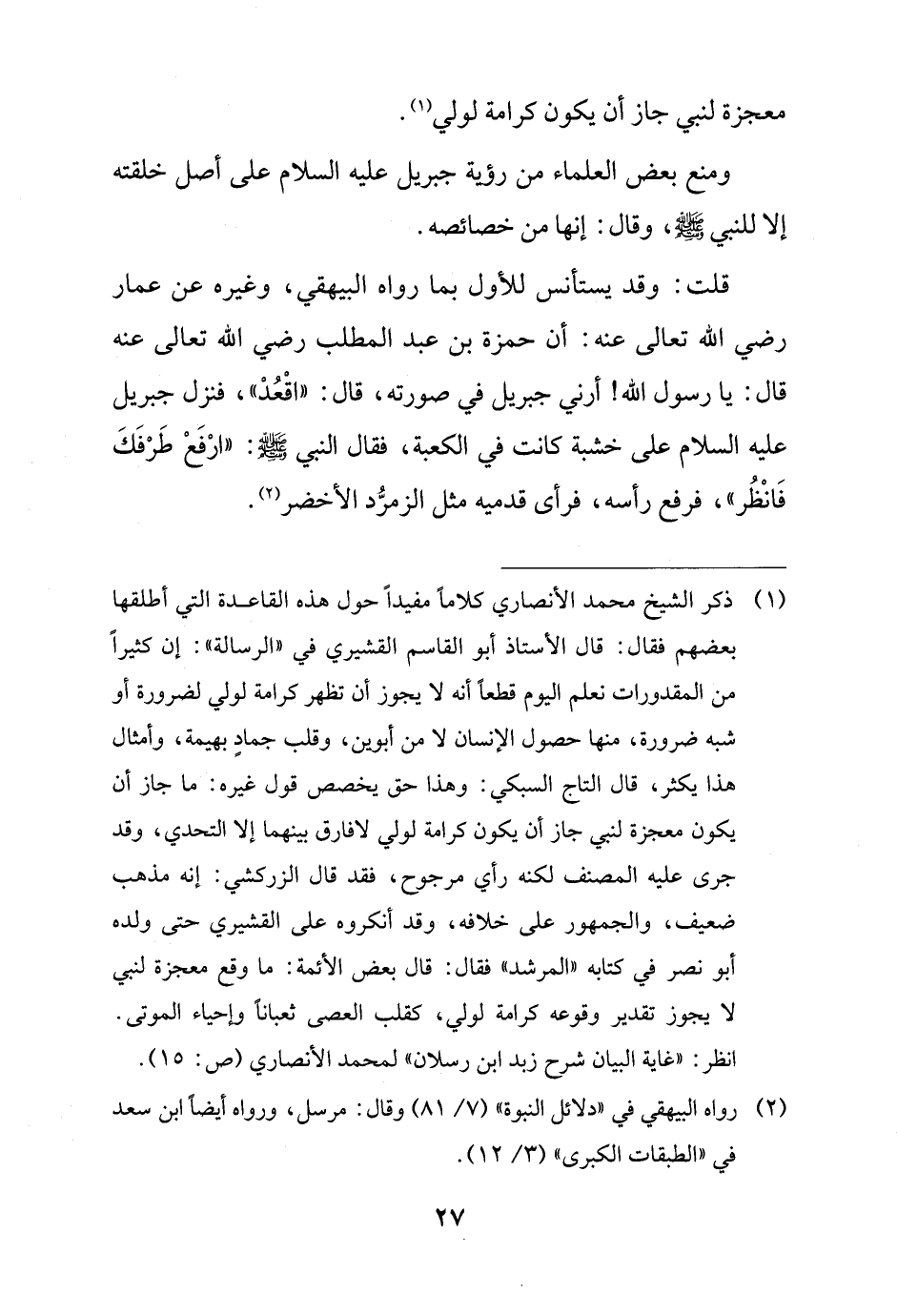 ومنع بعض العلماء من رؤية جبريل عليه السلام على أصل خلقته إلا للنبي - صلى الله عليه وسلم -، وقال: إنها من خصائصه.