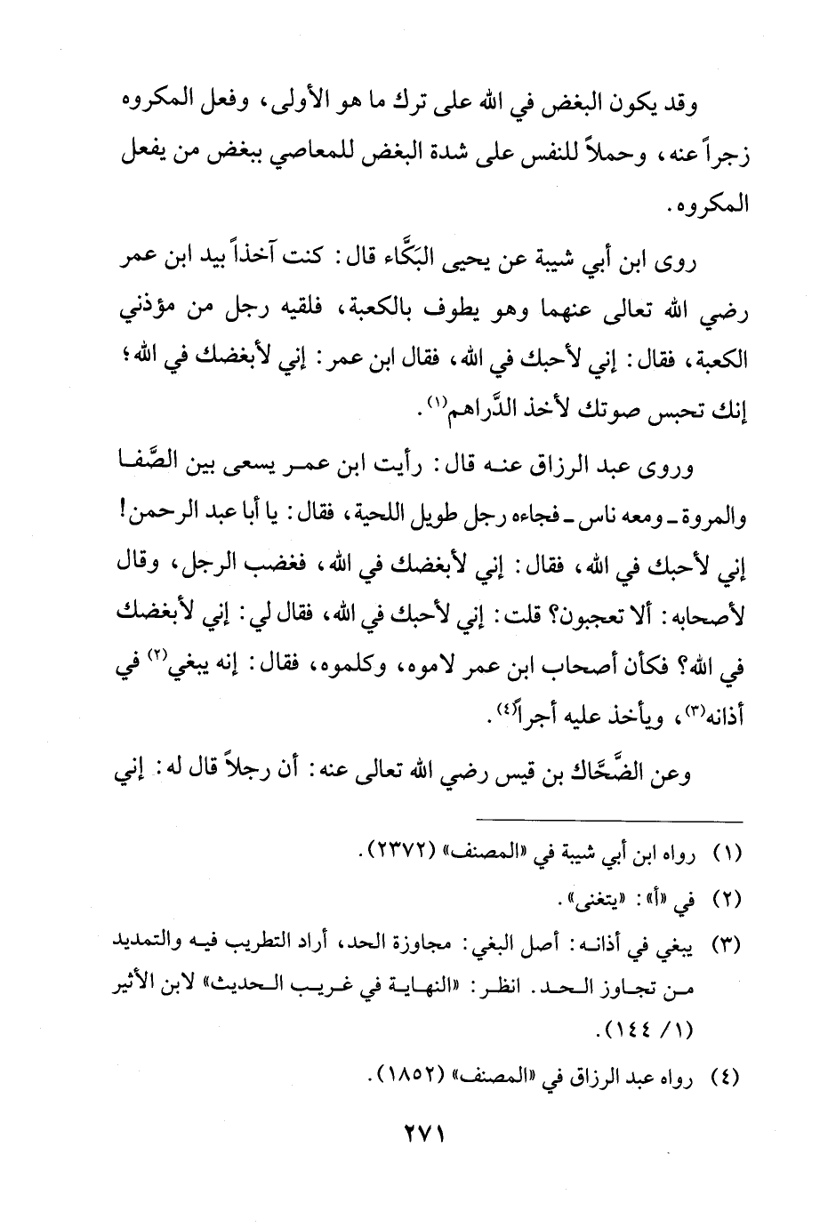 روى ابن أبي شيبة عن يحيى البَكَّاء قال: كنت آخذاً بيد ابن عمر رضي الله تعالى عنهما وهو يطوف بالكعبة، فلقيه رجل من مؤذني الكعبة، فقال: إني لأحبك في الله، فقال ابن عمر: إني لأبغضك في الله؛ إنك تحبس صوتك لأخذ الدَّراهم (¬1).