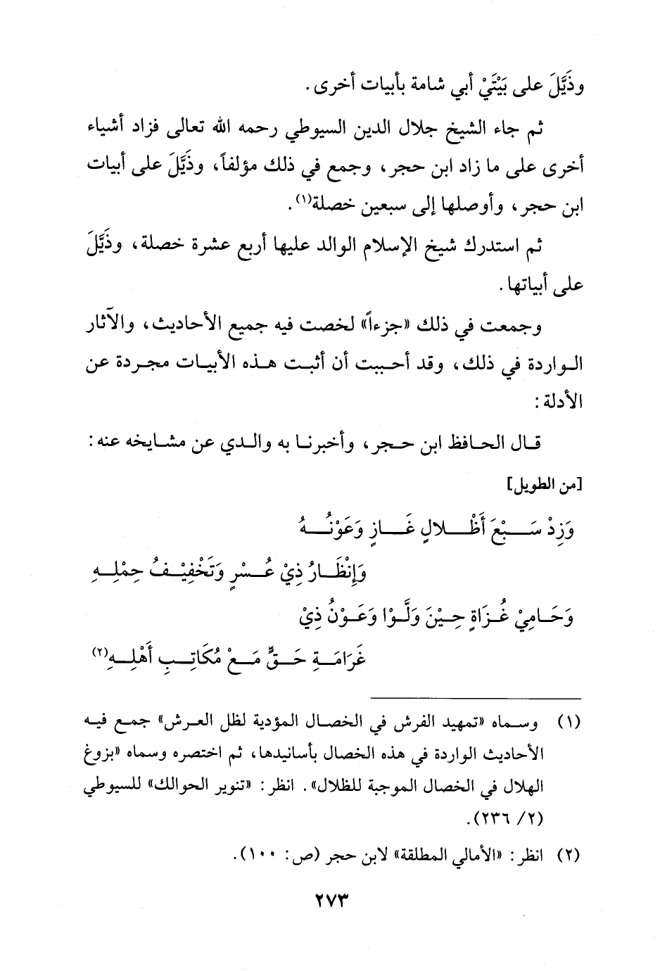 (¬1) وسماه "تمهيد الفرش في الخصال المؤدية لظل العرش" جمع فيه الأحاديث الواردة في هذه الخصال بأسانيدها، ئم اختصره وسماه "بزوغ الهلال في الخصال الموجبة للظلال". انظر: "تنوير الحوالك" للسيوطي (2/ 236).